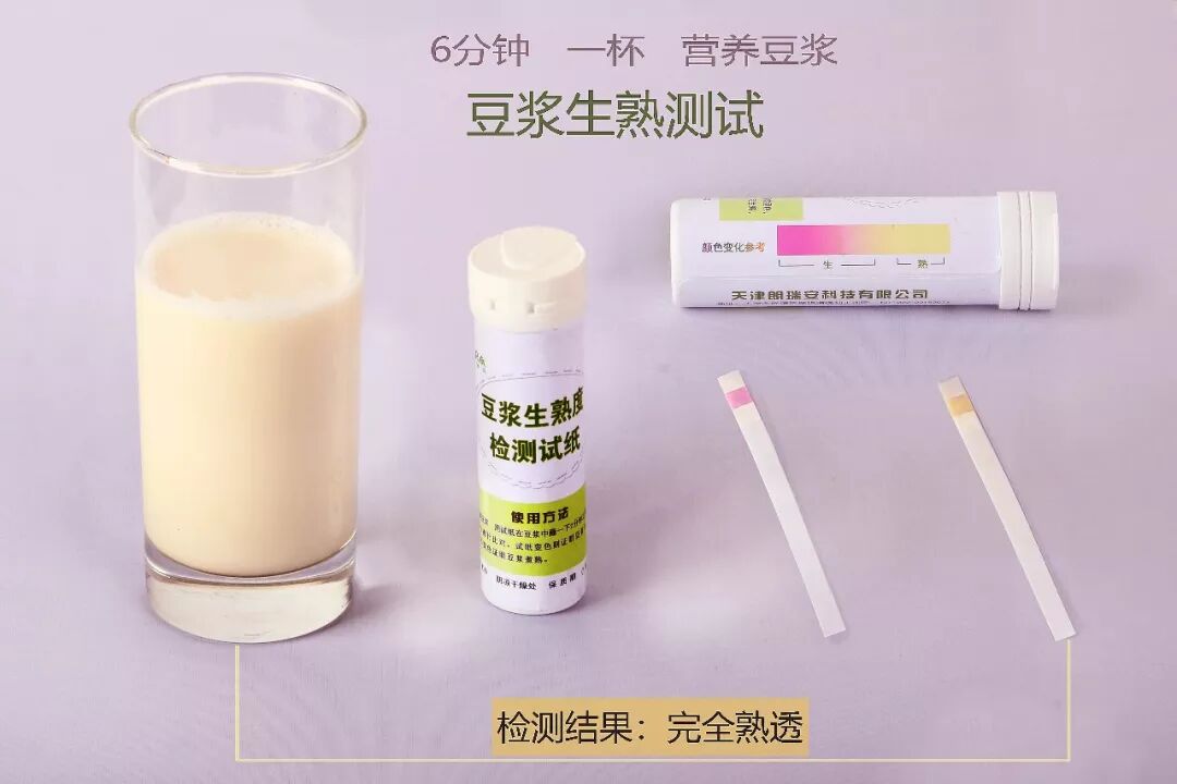 经6分钟的豆浆自动程序结束后再测,试纸呈黄色,说明此时豆浆是完全熟透,可直接饮用。